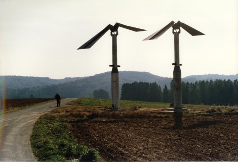 BALZGEFLÜSTER (‘courtship whispers’)1996 The sculpture Balzgeflüster is a system that responds kinetically both to gravity and wind. It consists of two identical elements. In each, a 1.5 tonne COR-TEN steel sheet construction is attached axially on a ball-bearing support upon an eight-metre column of galvanised steel tube. In the absence of wind and thanks to the greater mass being situated below the fulcrum, the COR-TEN structure finds its equilibrium in a horizontal position. Wind striking it from the side disturbs this balance. Owing to the structure’s relatively large mass, it tilts sluggishly into the wind. The sequences of movement of the two elements, given the turbulences of the wind, are never quite synchronised. The impression arises that the two pairs of wings instinctively attune their motions one to the other. |